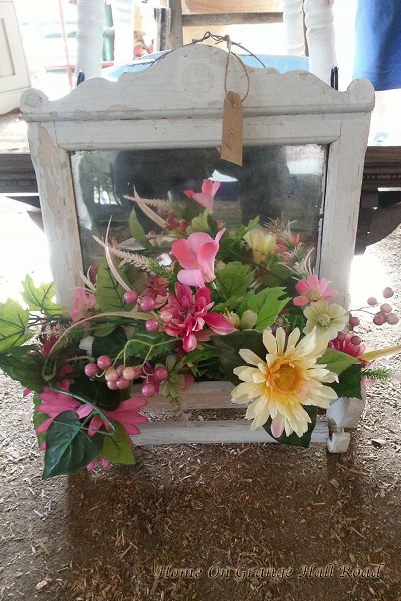 Isn’t this adorable! A mirror with a dowel rod on which to hang a beautiful linen tea towel or a lavender sachet. Carla added the lovely flowers.