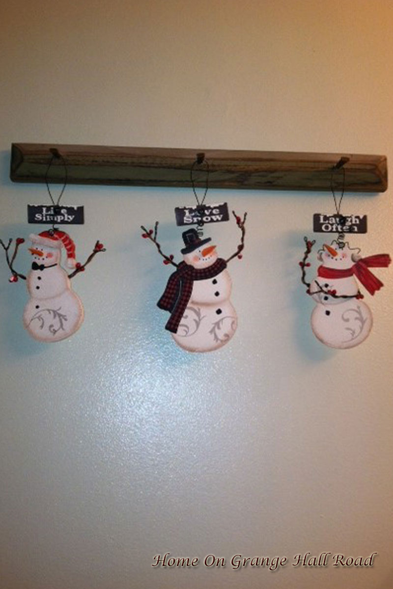 Three adorable little snowmen hanging on barn spikes on a piece of barn wood.