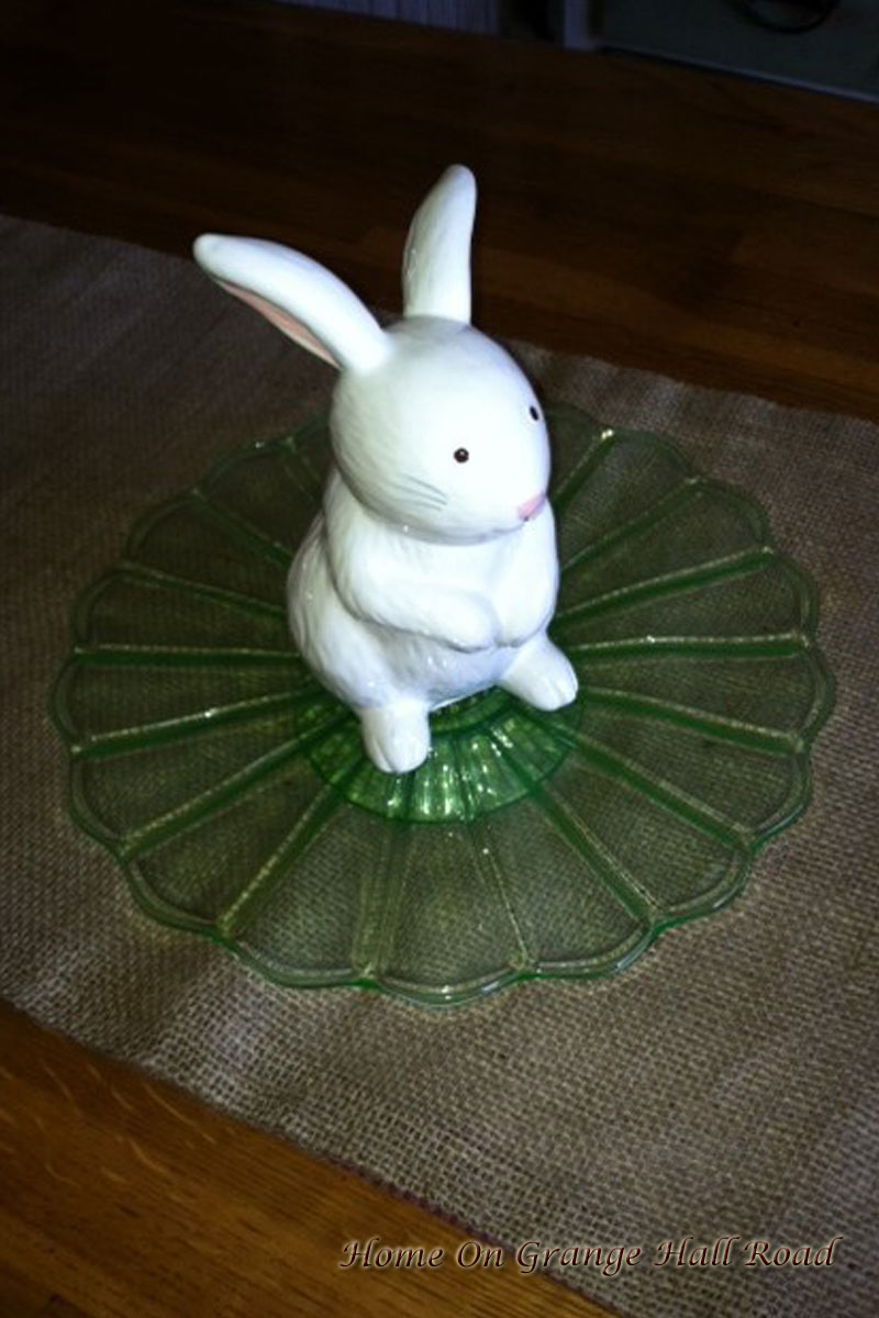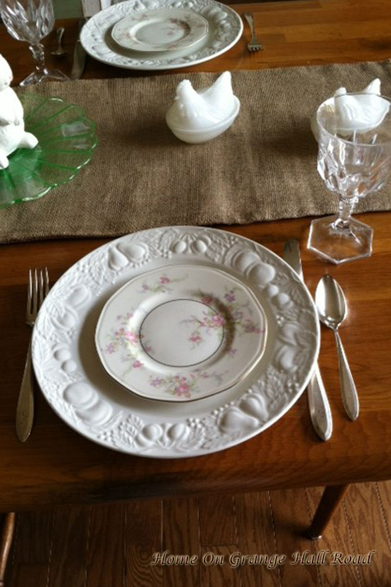 An adorable porcelain bunny on an antique green depression glass cake plate will serve as the centerpiece. Since I am using white as the base color for the table setting, I decided not to use a tablecloth or place mats. I like the contrast between the white dishes and decorations and the wood table and burlap table runner.