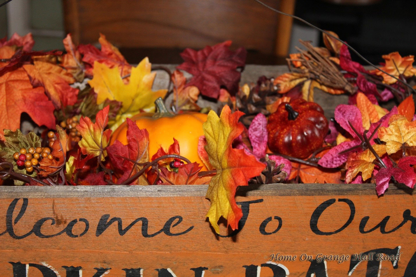 I filled the pumpkin box with faux pumpkins and fall garlands. It makes a beautiful centerpiece for the dining room table.