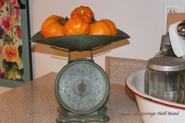 A scary pumpkin in an old wooden dough bowl. And of course, my beautiful Tiffany lamp.