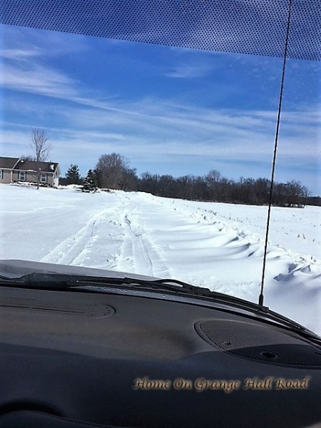 Here is what the driveway looked like as we headed out on Sunday morning for Church. Murray drove up and down a couple of times to make tracks.